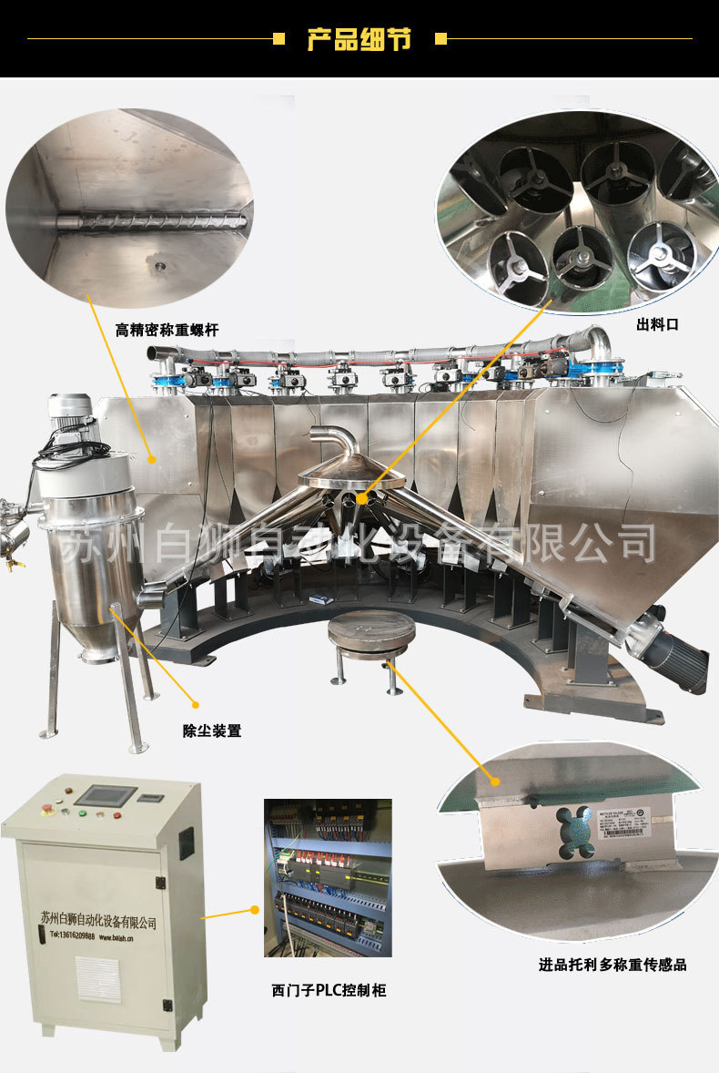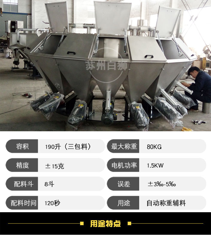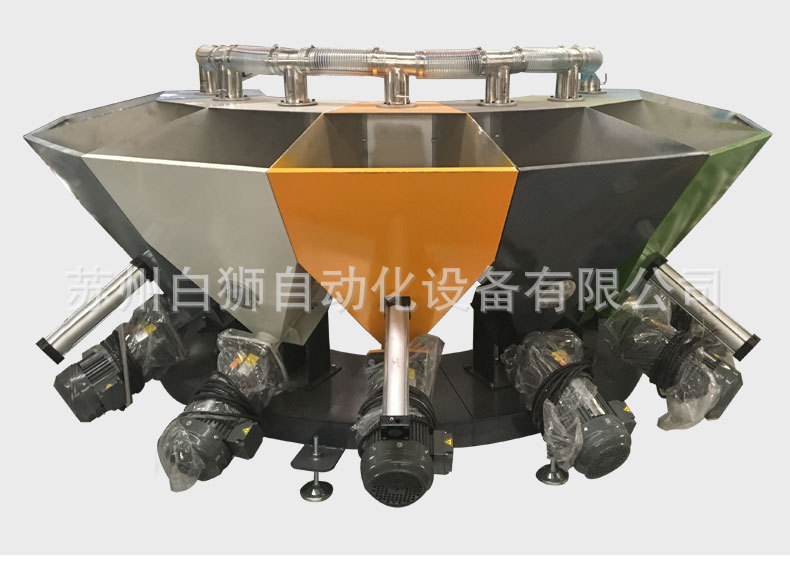 1、 單種物料誤差10克以內,九種原料(15KG)料兩分鐘左右。設備的型號一般配有4-9個料斗,容積約150-200L,也可根據客戶需求進行定制。常規配置中無料倉及接料斗除塵裝置。若帶料倉及接料斗除塵裝置,用管道及氣動閥門連接,分別用于料倉及接料斗除塵。