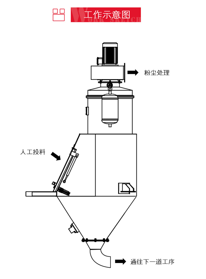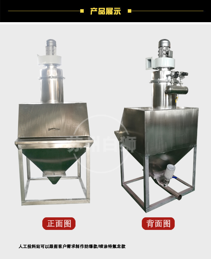 人工投料站(又名人工拆包機或小包拆包機):用于小袋物料粉粒體手工拆包卸料到下流設備的手動設備。設備內置過濾除塵裝置,使人工在操作中僻免環境污染及人工呼吸傷害,使人工能在清潔的環境中輕松工作。
